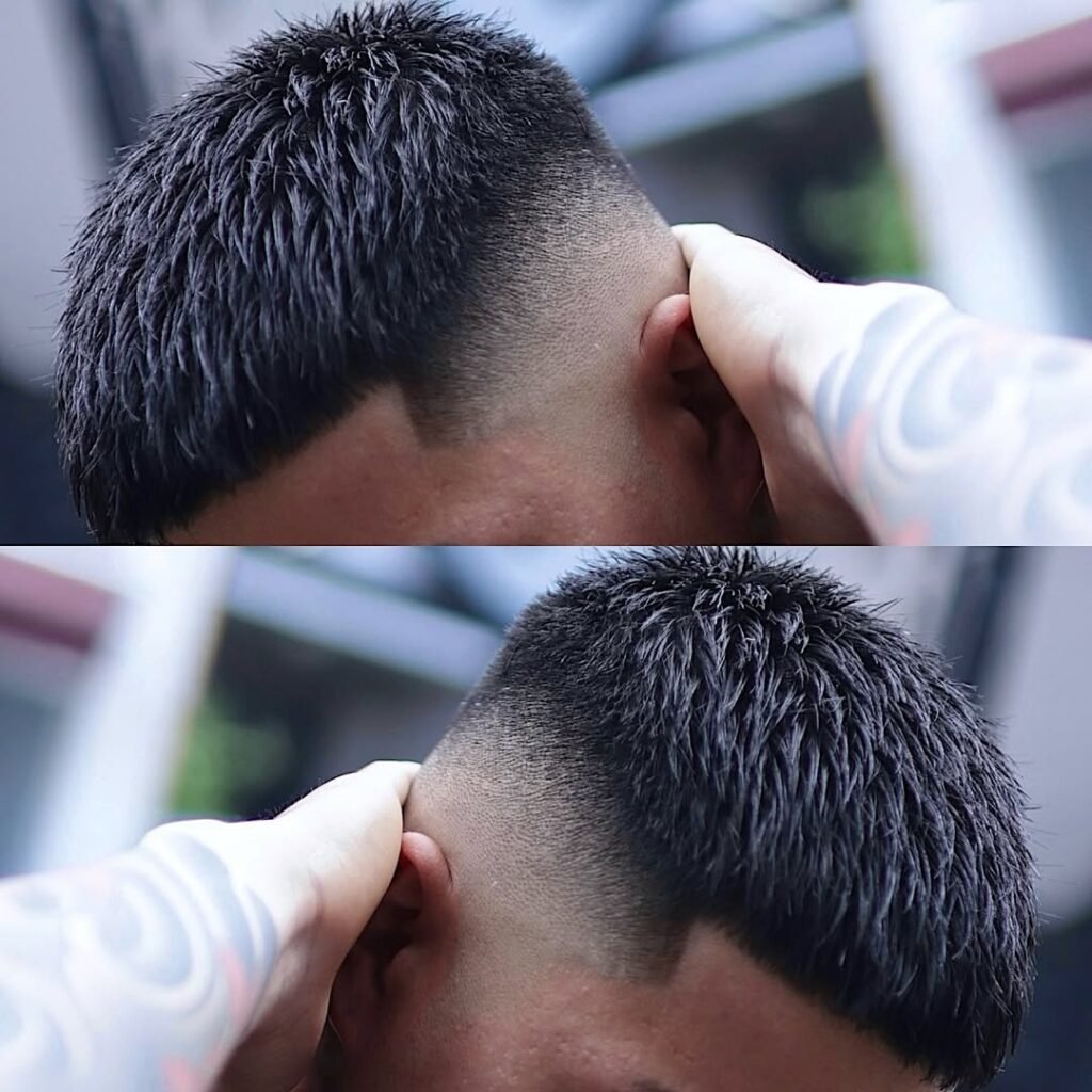 O buzz cut com taper fade, oferece uma transição suave entre os comprimentos, mantendo as laterais mais curtas e o topo levemente mais longo. Esse detalhe traz sofisticação ao corte e valoriza o pescoço e o formato do rosto, sendo ideal para quem quer um visual moderno.